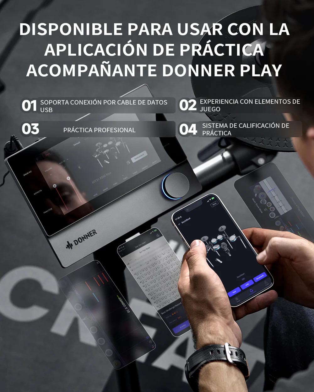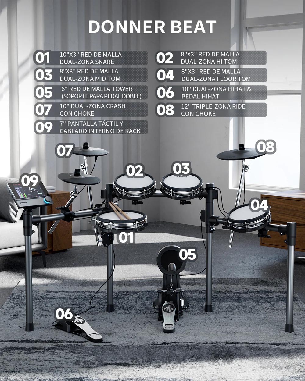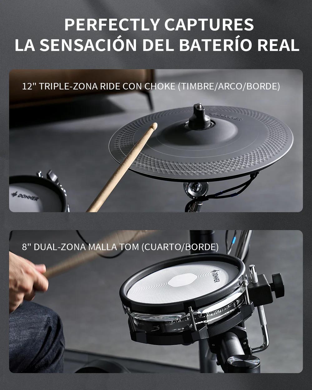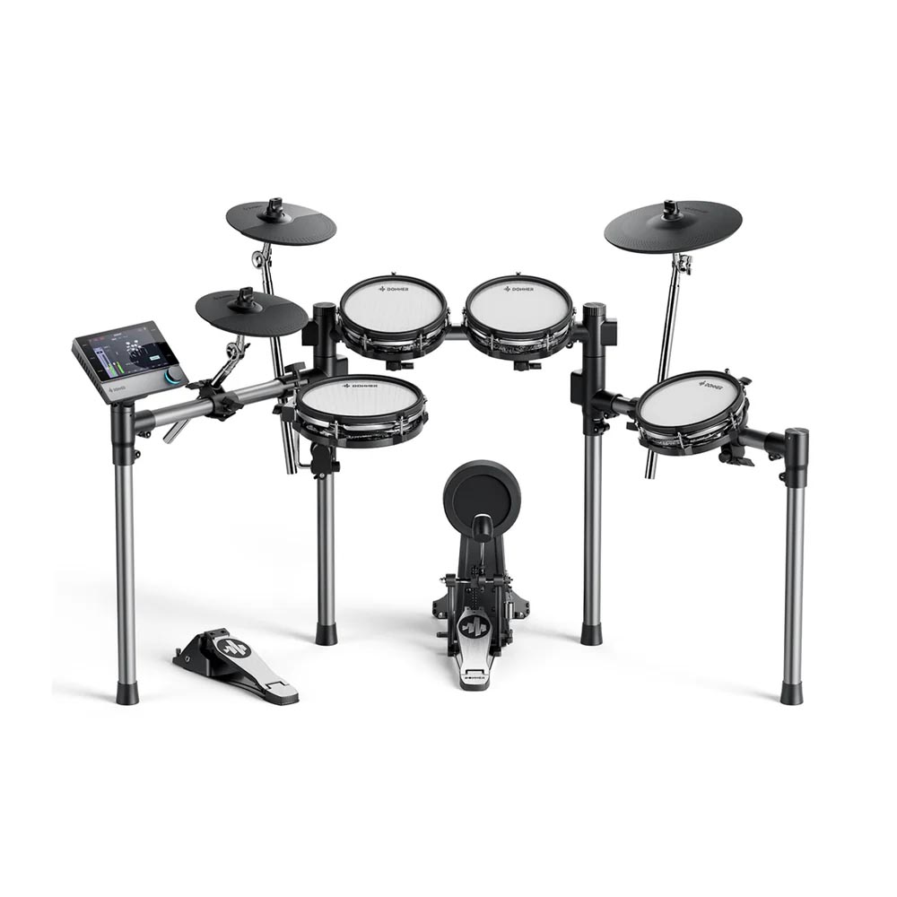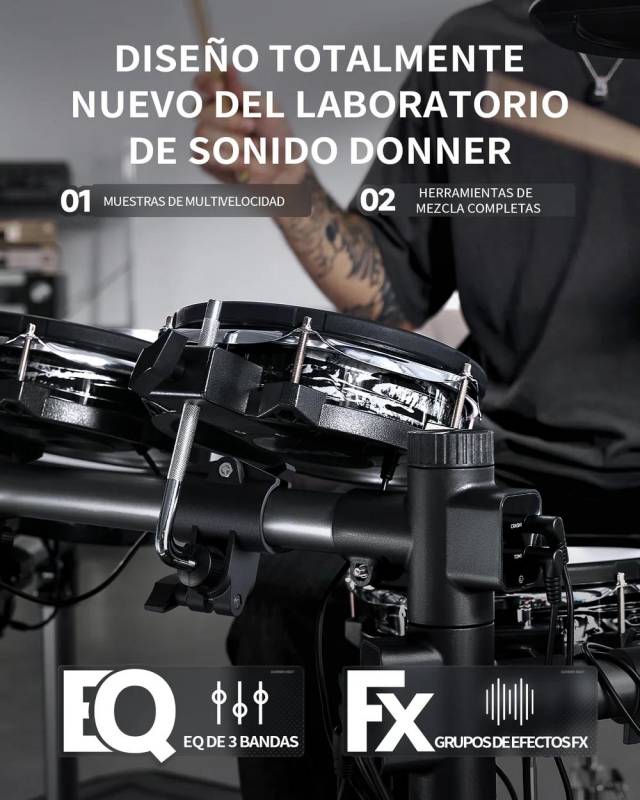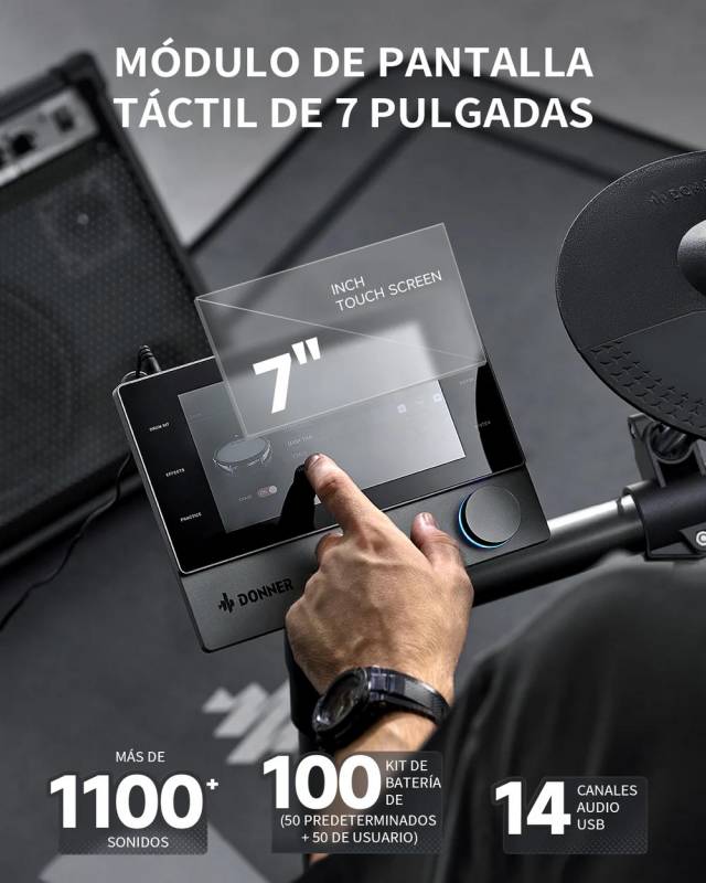 Módulo de control sin esfuerzo: experimenta una navegación perfecta en una pantalla táctil similar a una tableta de 7 pulgadas con un sistema operativo personalizado sensible y una perilla de control de precisión. Toma el control completo de tu sonido sin esfuerzo: disfruta de controles intuitivos que no requieren curva de aprendizaje. | Calidad de sonido inigualable: transforma tu batería con una impresionante calidad de sonido a 16 bits, 44.1 kHz. Utiliza potentes herramientas y efectos de ecualización integrados como compresor, filtro, reverberación y retraso para infundir tus ritmos con profundidad y versatilidad de calidad de estudio. Da rienda suelta a tu creatividad y da vida a tu música. | Auténtico platillo triple zona: descubre la notable diferencia con un platillo de triple zona de 12 pulgadas, diseñado por expertos con sensores de vanguardia que capturan cada golpe de borde a campana, asegurando una experiencia de juego verdaderamente auténtica y matizada. | Gestión de cables integrada: disfruta de una configuración ordenada con un marco que oculta eficazmente los cables, permite ajustes fáciles sin herramientas, y mejora tu espacio con un estilo moderno, equilibrando tanto la funcionalidad como la estética para una apariencia profesional. | Aplicación interactiva con diversos contenidos: Mejora tus habilidades de batería con la aplicación exclusiva DONNER PLAY, con canciones de práctica, juegos y lecciones interactivas que se actualizan constantemente para mantener tu experiencia atractiva y agradable.