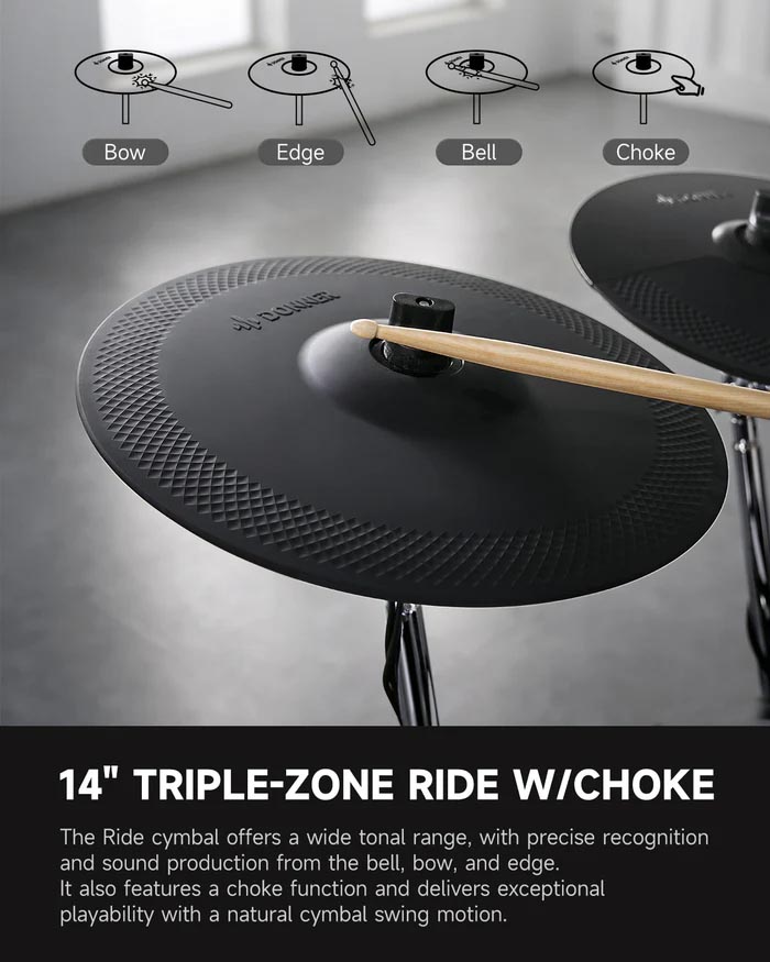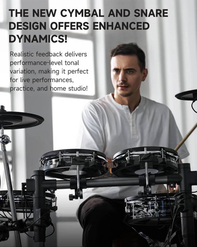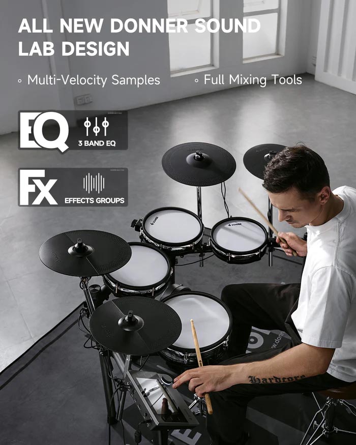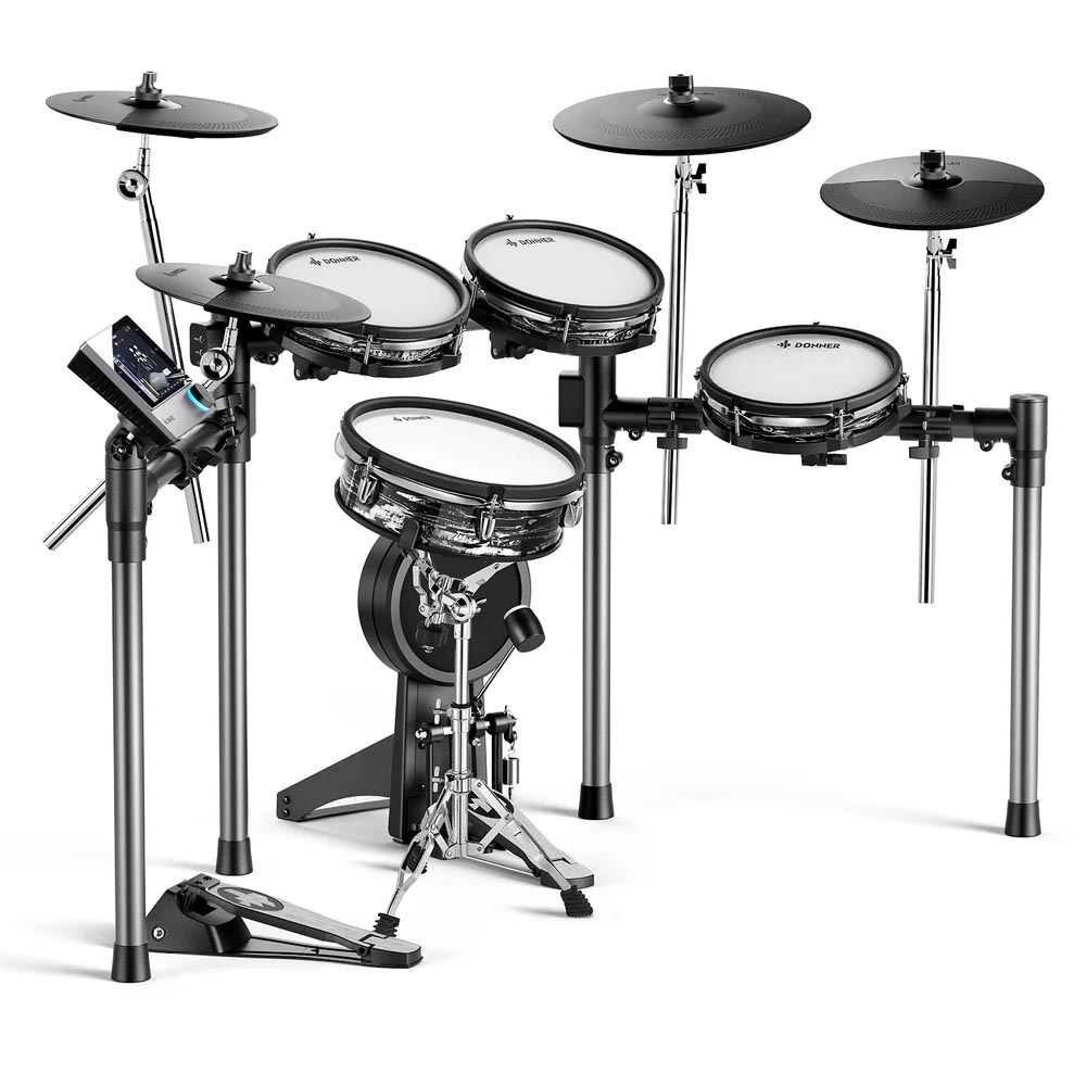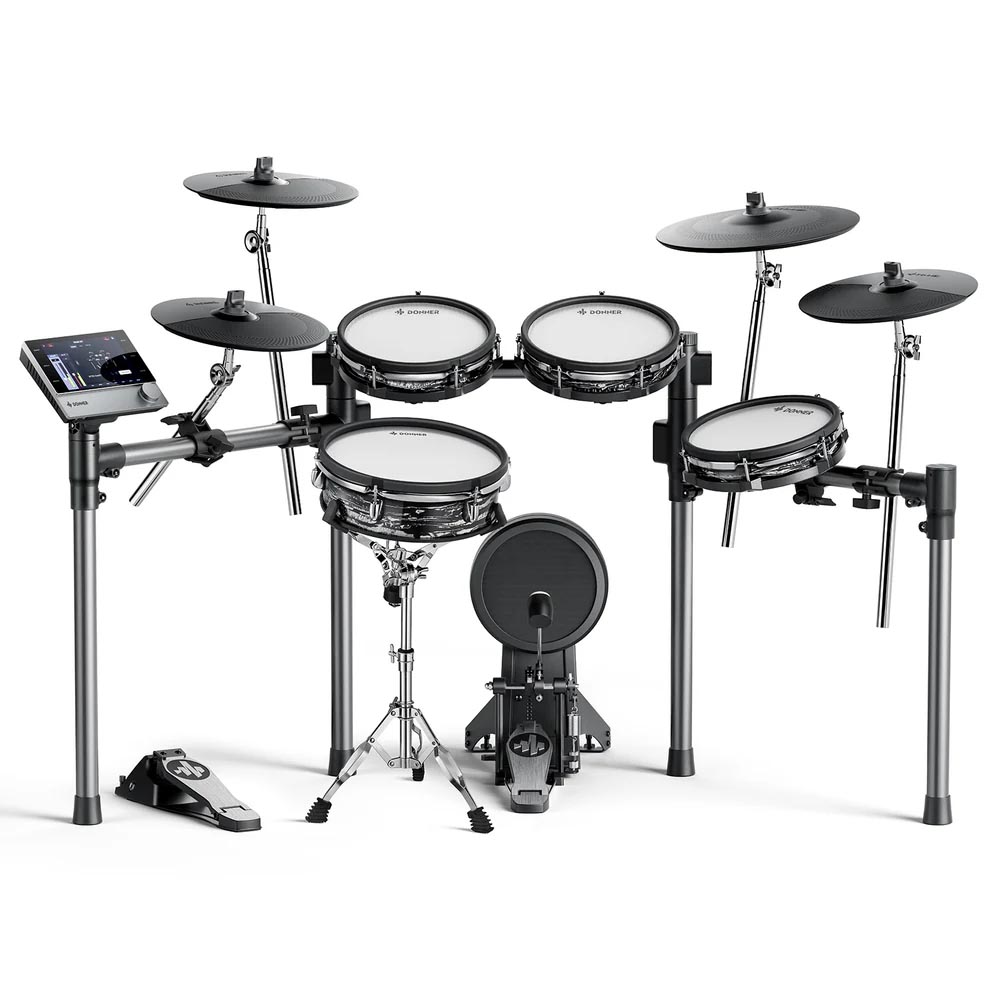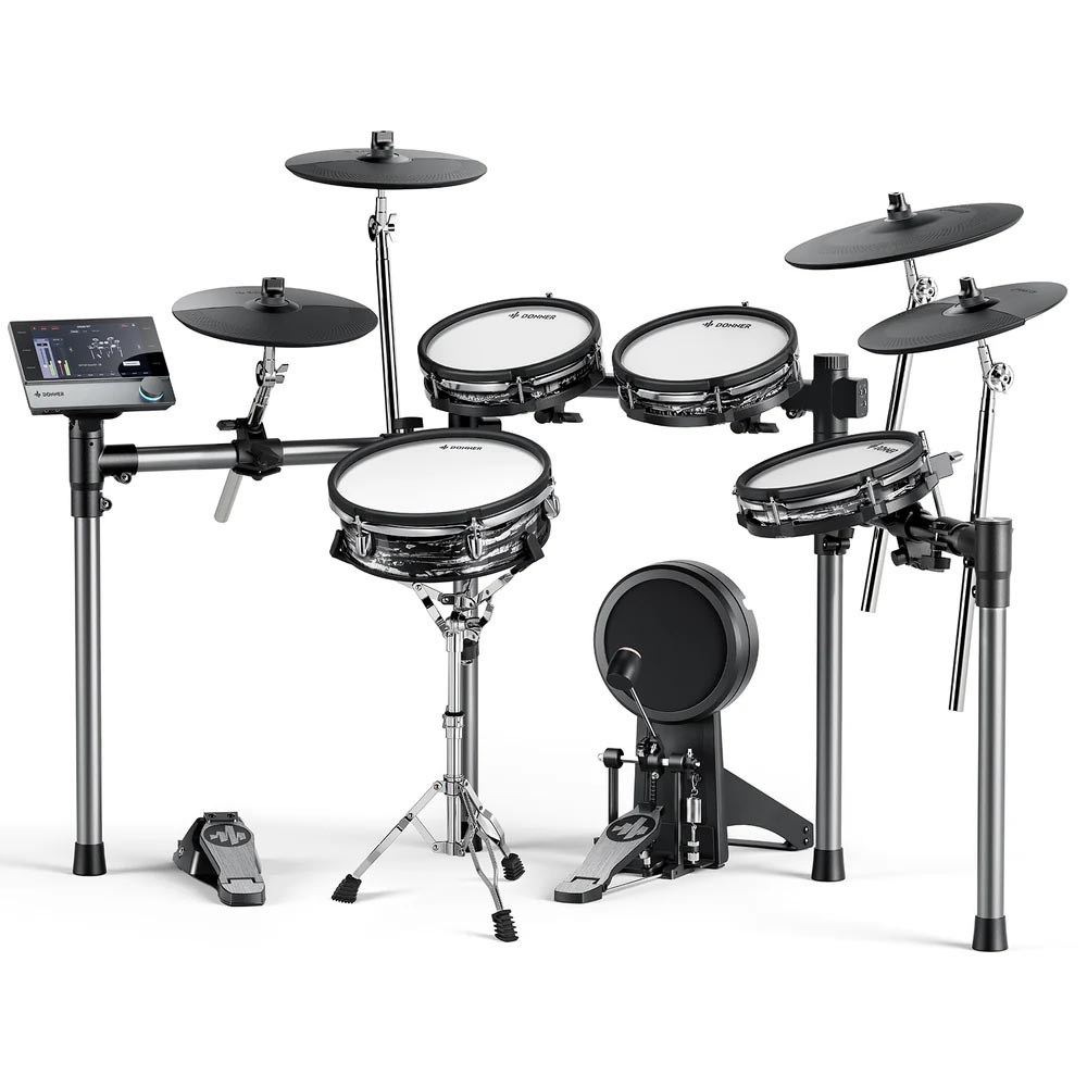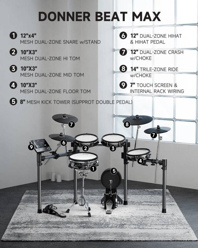 Pantalla táctil intuitiva de 7 pulgadas: experimenta un control perfecto con una pantalla táctil de 7 pulgadas fácil de usar, diseñada para una fácil navegación, imitando el funcionamiento de la tableta, ¡no requiere curva de aprendizaje! | Sonidos y efectos de batería profesionales: eleva tu sonido con los kits de batería avanzados de Donner, con audio de 16 capas y 16 bits para una riqueza dinámica y emparejado con herramientas de ecualización y efectos que amplifican tu expresión artística. | Características de práctica integrales: Domina tus habilidades con más de 160 piezas de práctica y corrección de errores en tiempo real, además de funcionalidad de grabación integrada para capturar cada sesión y ampliar tu repertorio creativo con opciones de exportación WAV y MIDI. | Toque mejorado: el Donner Beat Max está equipado con almohadillas de 12 pulgadas y platillos de 14 pulgadas que replican de cerca la sensación de los tambores acústicos. Disfruta de un área de impacto más amplia y disparadores precisos, asegurando un rendimiento auténtico e inmersivo cada vez que toques. | Diseño elegante y eficiente: disfruta de una configuración sin desorden con un marco integrado que alberga todo el cableado, asegurando ajustes rápidos y un aspecto aerodinámico, perfecto para actuaciones en vivo sin la molestia de los cables expuestos.