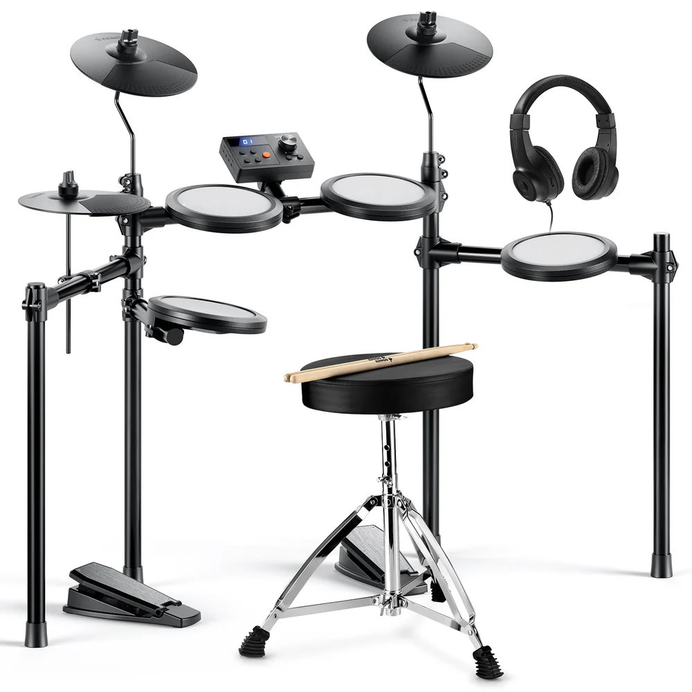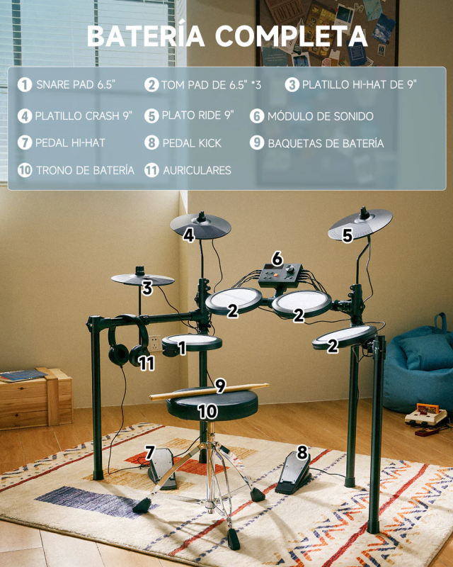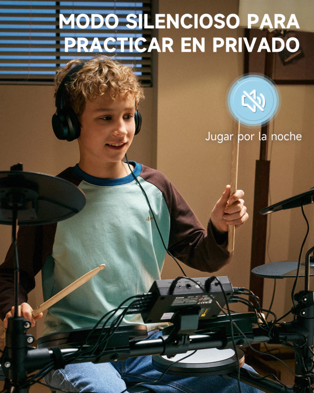 Practica en cualquier momento y lugar: Las baterías electrónicas ofrecen dos opciones de alimentación para máxima flexibilidad. Usa el cable incluido o cualquier power bank USB estándar (no incluido). Ya sea en casa o al aire libre, la batería portátil mantiene el ritmo dondequiera que llegue la inspiración. | Desde los primeros golpes hasta ritmos avanzados: ¡Comienza con 40 lecciones del curso de Melodics! Estos tutoriales de nivel profesional acelerarán tu aprendizaje, optimizarán tu práctica y establecerán bases sólidas para principiantes, al tiempo que ayudarán a los jugadores intermedios a avanzar. | Pedal doble silencioso: Experimenta una batería realista con el pedal de hi-hat de un solo disparo, que combina una acción mecánica auténtica con una respuesta precisa para una interpretación más detallada. | Múltiples interfaces para mayor versatilidad. Incluye metrónomo y grabadora integrados, salida para auriculares, compatibilidad con altavoces externos, conectividad USB-MIDI para integración con DAW y entrada AUX para tocar con fuentes de audio externas. Brinda conectividad versátil y sonido de alta calidad para jóvenes bateristas.